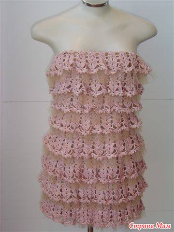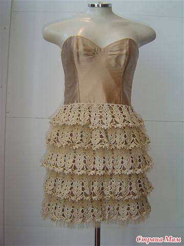 Http://s017.radikal.ru/i441/1202/73/7a975235c744.jpg1. Комбинированное с тканью платье для коктейля с многоярусной юбкой, связанной крючком.