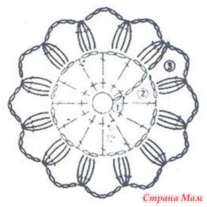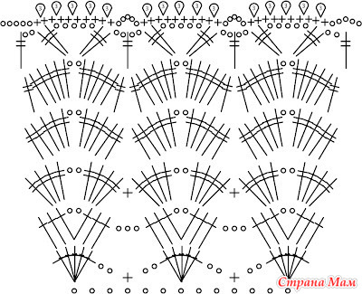 Схема вязания волана (рюши) крючком для юбки (вяжется по кругу, заменяя столбики подъема на воздушные):