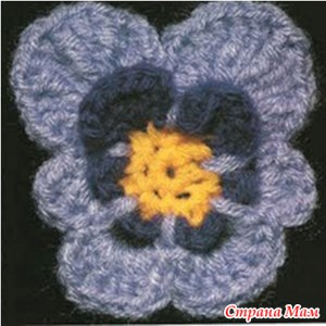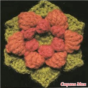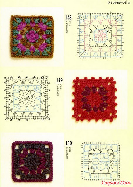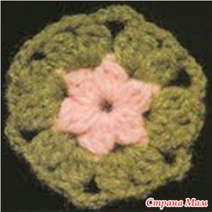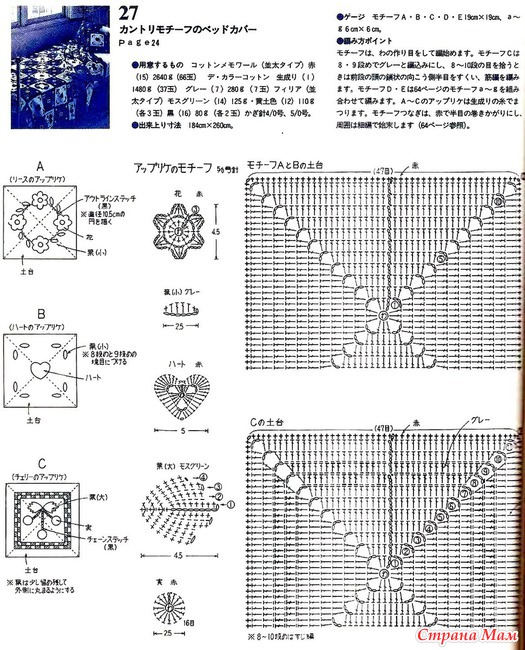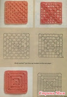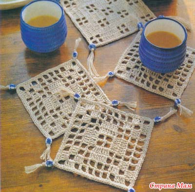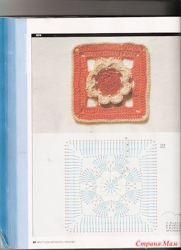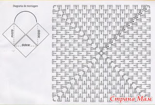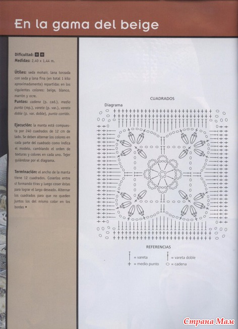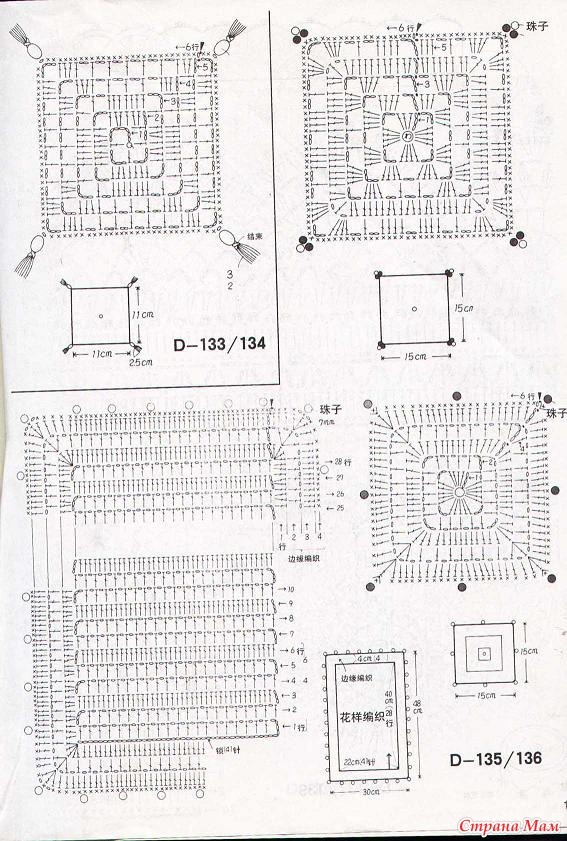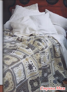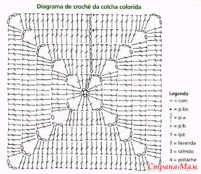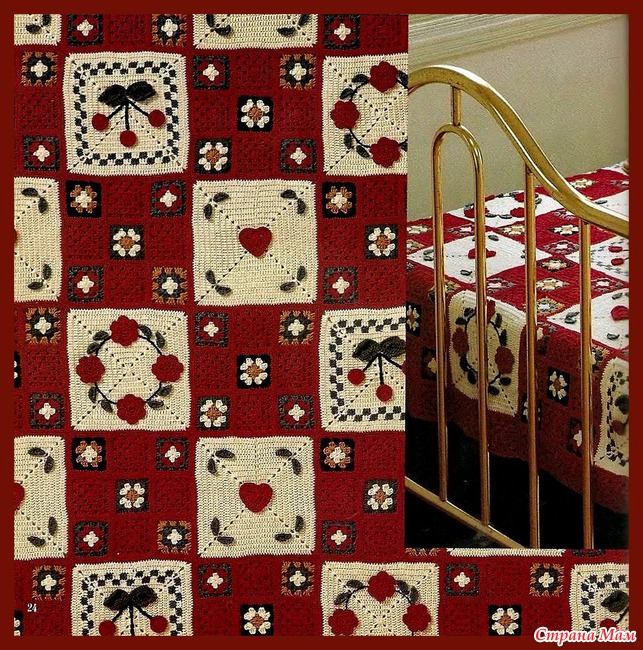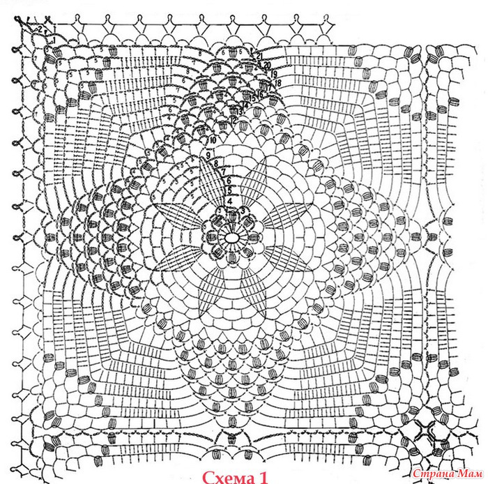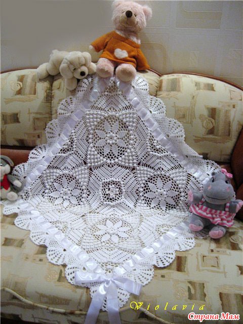 Свяжите по схеме 1 — 4 мотива, соедините их вместе. Весь плед обвязать 1 р.: *3 ст. с/ 4 накидами, 1 в. п.*, повторять от * до * до конца ряда. В уголках вязать 3 раза из 1 п. нижнего р. 3 ст. с/4н. Выполнить 1 р. полуст. с/н, закрыть соед. ст. и продолжить вязание кружевом схеме 2. Продеть ленточку по периметру плед и завязать бантом.