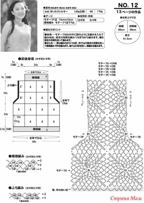 Полочка и спинка: до пройм вязать вместе. Набрать 104 (124) п. и выполнить итальянский набор = 206 (246) п. или соответственно по 53 (63) п. для полочек и 100 (120) п. для спинки. Через 6 р. связать 64 р. узором А, при этом начинать, как обозначено, вязать 9 (11) раппортов из 20 п. и заканчивать, как обозначено. На высоте 32 см = после 39-го р. узора в работе находятся 164 (196) п. Теперь вязать резинку на талии, как обозначено в 41-м р., в изн. р. петли вязать по рисунку. На высоте 47 см начать вязать с обеих сторон по схемам на первых и последних 12 п. лацканы, т.е. в 1-м лиц. р. начинать после кром. с 2 изн. и заканчивать 1 лиц., на последних 12 п. начинать с 1 лиц. и заканчивать 2 изн., кром. На средних 140 (172) п. вязать узором В, при этом начинать, как обозначено, вязать 8 (10) раппортов из 16 или 18 п. и заканчивать, как обозначено. После 1-го р. узора В в работе находятся 156 (192) п. Затем вязать прямо и для лацканов выполнить с обеих сторон прибавления и убавления, как обозначено. На высоте 66 см в работе находятся 196 (232) п. = по 20 п. лацканов, по 33 (42) п. узора В для попочек и 90 (108) п. узора В для спинки. Теперь начать выполнять проймы. Для этого в 1 лиц. р. провязать и отложить 51 (60) п., закрыть 4 п., провязать и отложить 86 (104) п. На последних (51) 60 п. закончить левую полочку, при этом закрыть для проймы с правой стороны в каждом 2-м р. еще 3 х 1 п. = 48 (57) п. На высоте 84 (86) см, в работе находятся 37 (46) п., закрыть для скоса плеча с правой стороны в каждом 2-м р. 3 х 9 (3 х 12) п. На оставшихся 10 п. продолжить вязать прямо заднюю планку выреза горловины, при этом в 1-м р. дополнительно набрать с края плеча 1 кром. На высоте 9 см петли закрыть. Закончить на средних 86 (104) п. спинку, при этом для пройм закрьпъ с обеих сторон в каждом 2-м р. 3 х 1 п. = 80 (98) п. На высоте 84 (86) см выполнить с обеих сторон скосы плеча, как на левой полочке, и одновременно с 1-м убавлением плеча закрыть для выреза горловины средние 14 п. и через 2 р. закрыть с обеих сторон от них 6 п. Симметрично левой полочке закончить правую полочку. Общая высота = 86 (88) см.