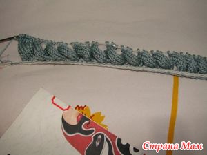 На высоте 18 см. от начала штанин для разреза застежки разделить работу на 2 части и вяз. левую часть передней детали отдельно след. образом: 34 п. узора по схеме, 6п. плат. вяз. в качестве планки застежки. Оставшиеся 34 п. сн. на вспом. спицу.