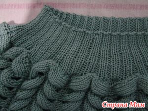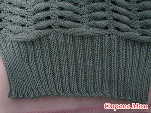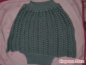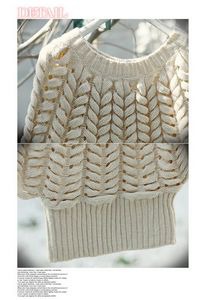 На спицы набрать 46 п. , связать 6 р. плат. вяз. и продолжить узором по схеме. На высоте 14 см. уб. для реглана с обеих сторон в каждом 2-м р. 6 раз по 1 п. и сн. оставшиеся 34 п. на вспом. Спицу.