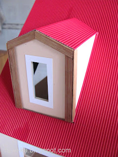 Вырезаем лист с припусками 3-5 см, наклеиваем его с изнаночной стороны на лист плоского картона, сушим под прессом, чтобы не покоробился, после высыхания сгибаем с помощью линейки. Готовую крышу приклеиваем к откосам двусторонним скотчем.