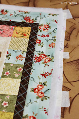 Я простегала в шов блоки с вышивкой и аппликацией и узкий бордюр по периметру. Обвела горшочки, чтобы придать им объем. А на внешнем бордюре "нарисовала" ненавязчивые листики. Так же и квадраты украсила неотвлекающей стежкой.