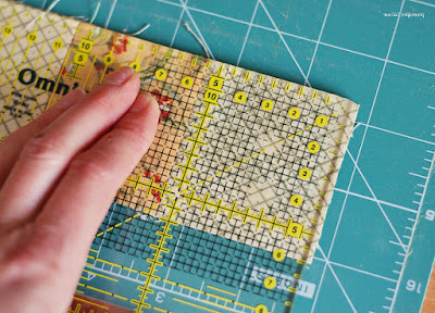 После сшивания подравниваем их, если есть необходимость. Обратите внимание, что средний квадрат по ширине - 5 см, каким и должен быть итоговый размер детали. А вот крайний - 5,5 см (т.к. один край детали не соединен со следующим квадратом) с небольшим остатком, который я и обрезала. Подобным образом я измеряю и выравниваю при необходимости все блоки после сборки, т.к. не всегда сшивание деталей проходит миллиметр в миллиметр.