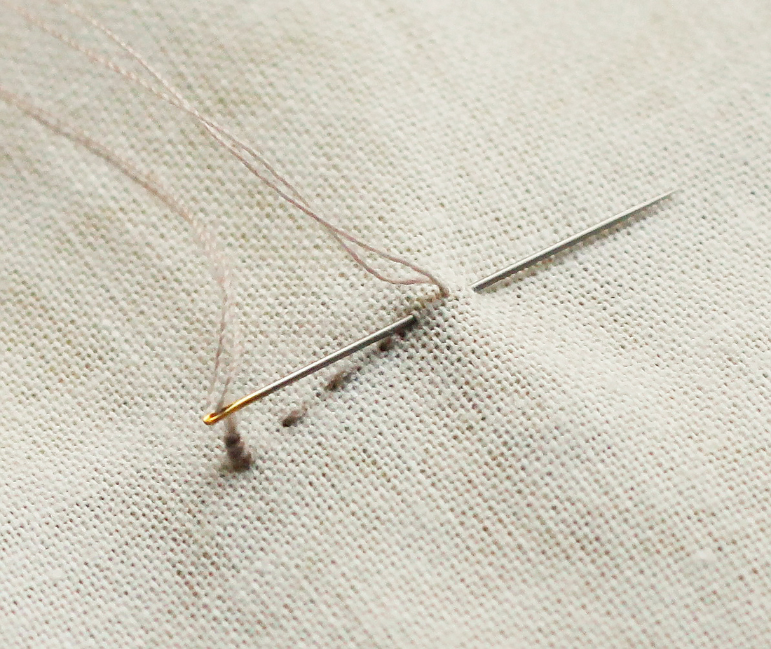 Перед началом каждой новой строчки необходимо вытянуть нижнюю нить на поверхность, чтобы, во-первых, с обратной стороны не было комка из спутавшихся нитей, а, во-вторых, в последующем мы закрепим начало строчки, а нити спрячем внутрь сэндвича.