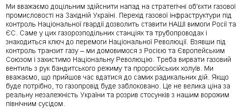 «Свободовцы» не принимали участия ни в захвате зданий, ни в боях на улице Грушевского, ни в столкновениях в «беркутовцами», для них было очень важно сохранить статус-кво. Именно поэтому, когда во многих регионах Украины начались захваты зданий государственных учреждений, представители партии стали заявлять о том, что все это – провокации провластных сил и что они настроены на мирное решение конфликта. Однако немного позже руководство партии осознало, что играть в умеренность уже достаточно, ведь и силы на Майдане стали более радикальными, да и призывы периода начала революции больше неактуальны. Более того, гораздо большее одобрение у общественности, даже у самых аполитичных ее представителей, вызывают более радикальные группировки – «Спильна справа» и «Правый сектор», которые атакуют спецназовцев и захватывают админздания. Более того, в некоторых средствах массовой информации появилась информация о том, что если бы в ближайшее время в стране проводились выборы, то «Правый сектор» легко сумел бы преодолеть пятипроцентный рубеж, отняв часть голосов у той же «Свободы».