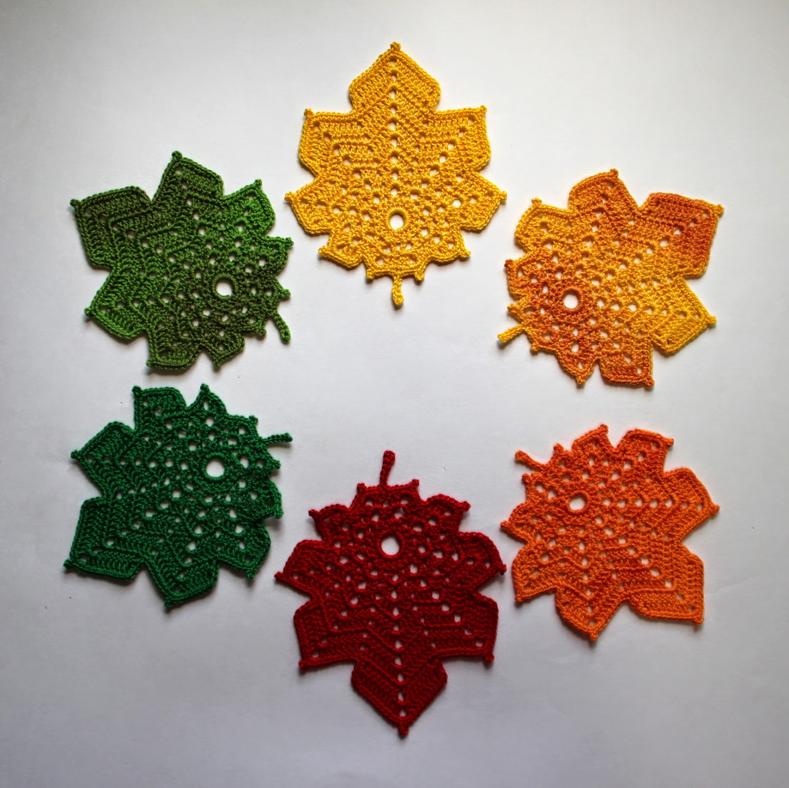 Думаю, не ошибусь, сказав, что первое, с чем ассоциируется осень - это разноцветные осенние листья. У меня для этого задания набор подстаканников в форме листьев каштана , связанных крючком.