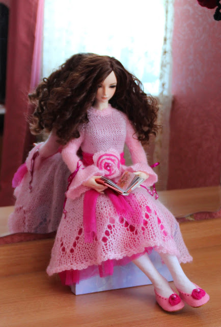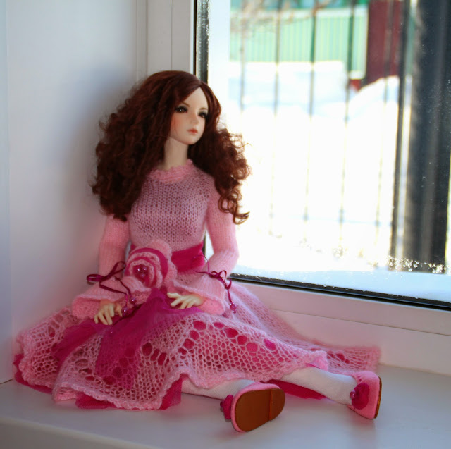 Специально для такого торжественного и волнительного случая был связан-сшит новый наряд, состоящий из плотных белых чулочков, розового мохерового платья элегантной длины, нижнего платья с юбкой из мягкой сетки цвета фуксии и розовых фетровых балеток. Платье украшено мягким поясом из сетки с вязаной розой, атласными лентами с бусинами в рукавах. На мой взгляд, к платью больше бы подошли изящные туфельки или ботиночки на каблучке, но я пока научилась шить только балетки))). В общем, получился образ романтичной девушки из приличной семьи))).