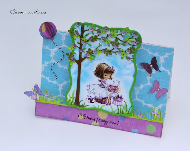 Хочу показать открытку, которая сложилась у меня к этому событию. Сделала я ее больше для себя, чем для Лизы. Очень хотелось применить на практике некоторые приемы, используемые другими мастерами: сделать открытку именно такой конструкции, самой сделать фон с облаками, использовать рамку с деревом и иллюстрацию Марины Федотовой. Мне кажется, девочка на картинке очень похожа на Лизу))