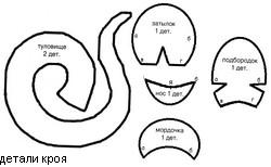 Детали кроя показаны на рисунке. Из зеленого велюра нужно выкроить: туловище — 1 деталь