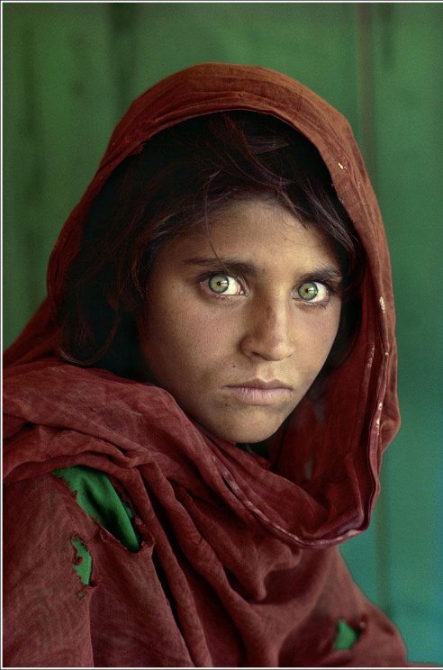 12-летняя афганская девочка - знаменитая фотография Стивена Маккьюри, сделанная им в лагере беженцев на афганско-пакистанской границе. Военные вертолёты разрушили деревню юной беженки, вся её семья погибла, и, прежде чем попасть в лагерь, девочка проделала двухнедельный путь в горах. После публикации в июне 1985 г. эта фотография становится иконой National Geographic. С тех пор этот образ где только не использовался - от татуировок до ковриков...