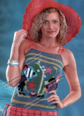 Летняя майка крючком. Можно использовать хлопок голубого цвета и крючок №4. Вязание не имеет описание на русском, есть простая схема.