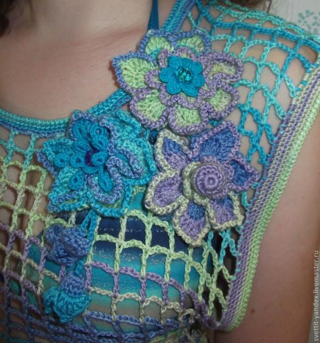 Салатовая безрукавка на широких бретелях, с интересной цветочной вставкой на спинке. Низ отделан каймой из таких же цветочных мотивов. В комплект можно связать ажурную кофточку из таких же цветочных мотивов, которая будет органична как в комплекте, так и как отдельный аксессуар! Безрукавка