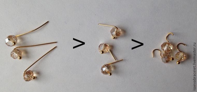 Для начала делаем заготовки из маленьких золотых бусинок. Надеваем пин с шариком, загибаем, отрезаем кусачками, оставляя 1 см. Затем закручиваем круглогубцами, делая петельку. И таких заготовок нам надо много.