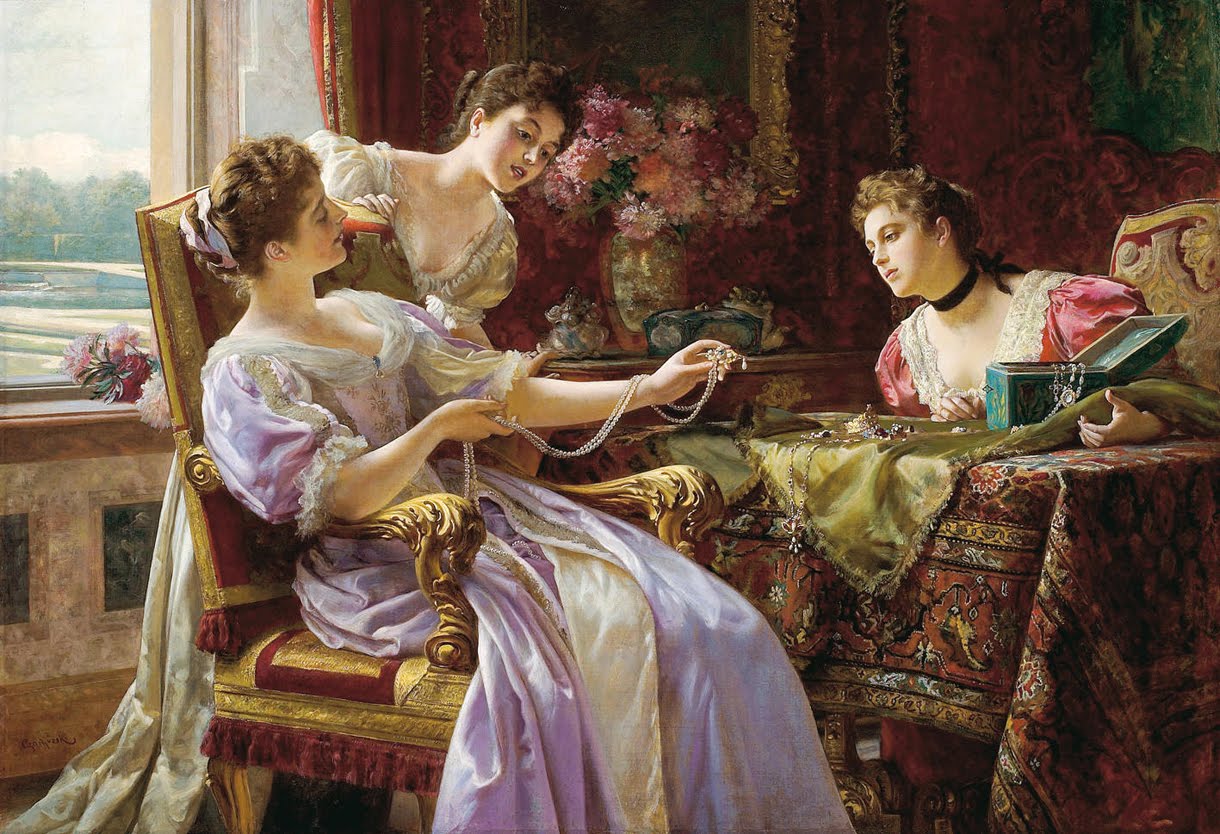 После создания серии исторических картин он пишет иллюстрации, где изображает женщин в нарядах 17-18 вв. – это яркие красочные картины, наполненные особым светом, идущим от прекрасных юных лиц, благоухающих цветов, атласных одежд и украшений.