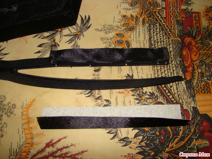 готовим замок, берем две полоски ткани длиной как донышко сумки, шириной, когда все это сложиться вместе с замком то должно быть ширина донышка, прокладываем дублирином или флизилином и притачиваем с обеих сторон замка.