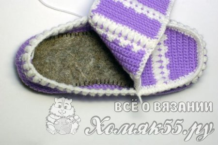 Чтобы подошва пинетки имела нужную форму, я провязывала 2 раза с каждой стороны по 2 петли, 1 раз - 3 петли вместе.Т.е. 1-я убавка - 2 петли вместе, 2-я убавка - 2 петли вместе, 3-я убавка - 3 петли вместе, 4-я убавка - как 1-я и т.д. Таким образом закрываем по 27 петель с каждой стороны. Останется 9 центральных петель и 9 отложенных петель. Их сшиваем между собой трикотажным швом "петля в петлю".