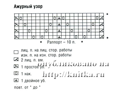 ажурного узора, 5 п. лиц. гл., 22 п. лиц. гл., выполняя 1 уб. в центре (= 21 п.), и 5 п.