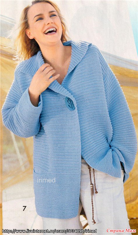Еще 27 (или 27, 29, 31, 33) рядов вяжутся прямо. Окончить лицевым рядом.