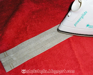 5. для придания закладке плотности отрезаю кусочек толстого термо-флизелина по ширине закладки и по длине начиная от шва-"погона" и заканчивая декоративным верхним швом (не утолщая загнутый верх), приклеиваю флизелин с помощью утюга: