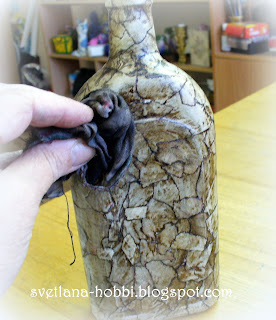 Теперь кисточкой наносим на бутылку битумный лак, небольшими площадями, т.к. быстро сохнет. Если лак густой, можно разбавить все тем же растворителем.
