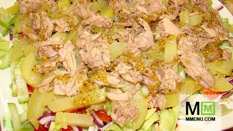 Выложить вилкой равномерным слоем кусочки тунца. Полить заправкой, настаивать 30 минут. Перед употреблением перемешать салат.