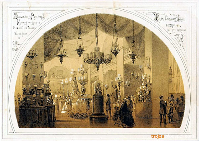 Выставка русских мануфактурных изделий в залах таможни в Санкт-Петербурге в 1861 году. Русских художественный листок В. Тимма.