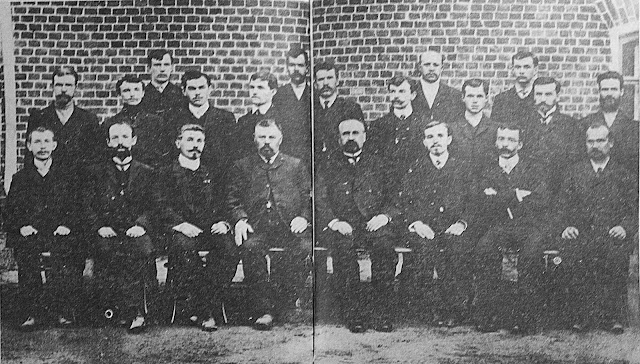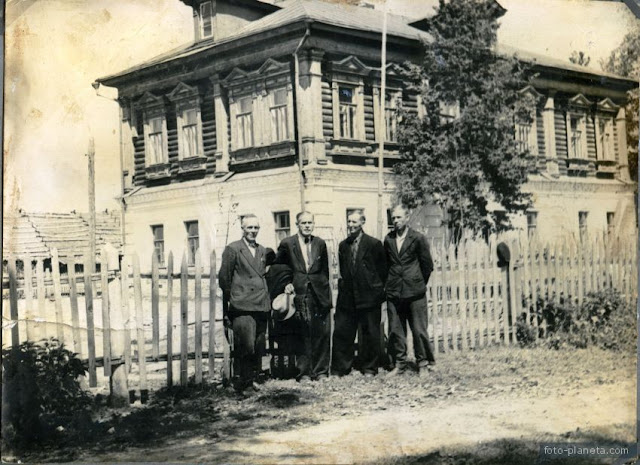 А.М. Залогин среди квалифицированных мастеров Фряновской фабрики на крыльце усадьбы.