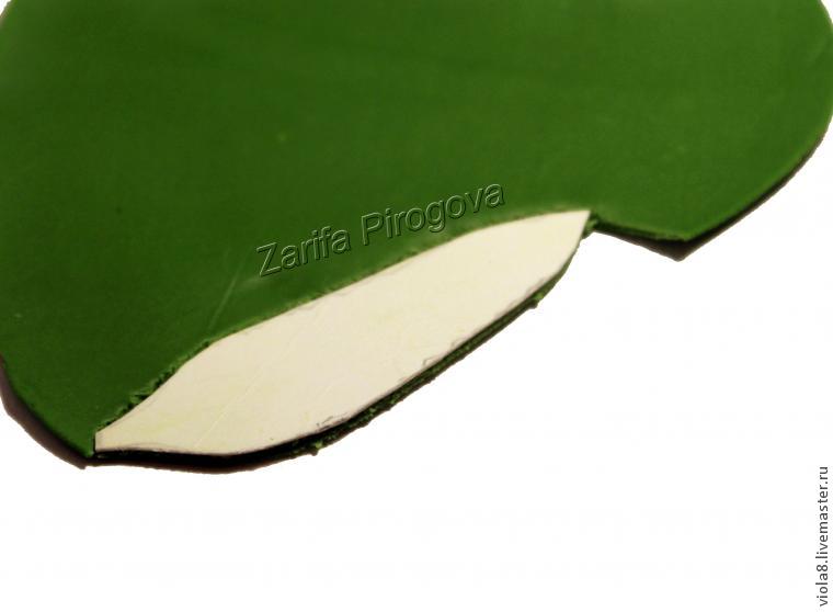 Оставляем подсыхать. Пока лепестки сохнут, раскатаем пласт глины, окрашенный в зелёный цвет Виридоновой зелёной. Вырежем при помощи шаблона основу листа мака.