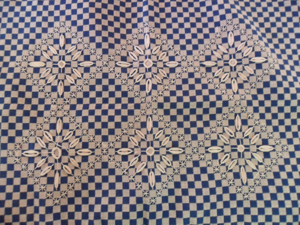 На русском языке её так и называют - вышивка на ткани в клетку. Есть легенда, о том, что во время Великой Депрессии в Америке одна домохозяйка не могла себе позволить купить кружево, чтобы украсить простое платье в клетку и зонтик, и придумала способ имитировать кружевное полотно вышивкой снежинками. Когда она предстала перед своим мужем в новом наряде, он сказал, что это похоже на то, как три цыпленка бегали по двору своими маленькими лапками.