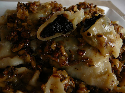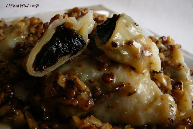 Мука, яйцо и щепотку соли и залить кипятком и перемешать деревянной ложкой. Когда тесто остынет немного. Раскатать тесто, вырезать небольшие кружки В центре каждого из них положить чернослив и налепить вареники