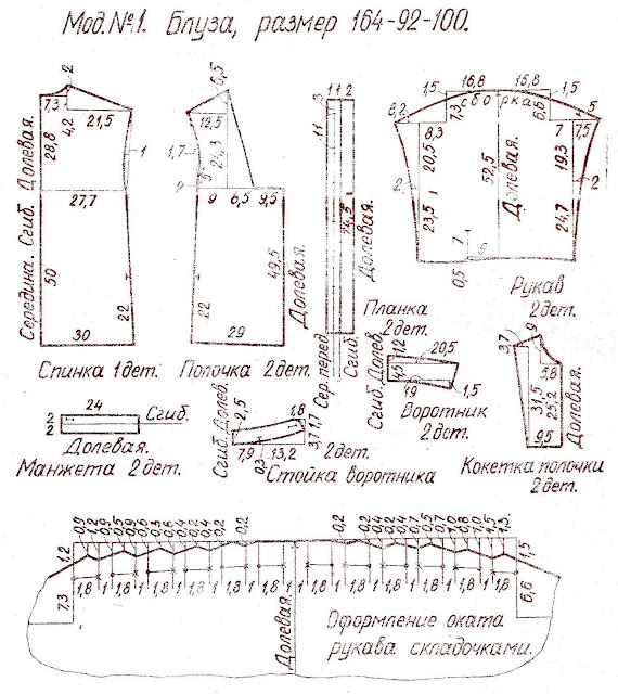 Так как эта блузка имеет довольно большой объем, мы рекомендуем ее для стройных женщин. Выкройка в уменьшенном виде дана для размера 164-92-100 (46-й), без припусков на швы. Эту же выкройку можно без изменений использовать и для других размеров - 164-88-96 и 164-96-104. По окату рукава можно застрочить мелкие складочки. Как это сделать, показано на чертеже.