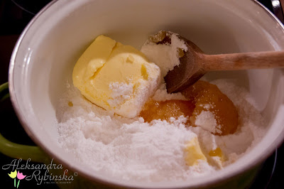 1.Положить в кастрюлю масло, мед, сахарную пудру.