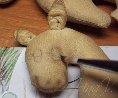 Тушку тонировала акриловой краской: набираем немного краски на сухую кисть, промакиваем ее о кусочек заранее приготовленной для этого ткани, и наносим тонировку по швам.