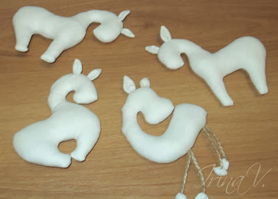 Переносим выкройку на ткань сложенную вдвое, в моем случае это бязь, так же можно использовать лен, хлопок. Я не вырезаю, шью сразу, поэтому припуски на швы не делаю. Одна из лошадок сделана по выкройке взятой в блоге Ольги Блощицыной, поэтому выкладывать не буду, а МК (мастер Надежда Колотьева) можно посмотреть здесь.