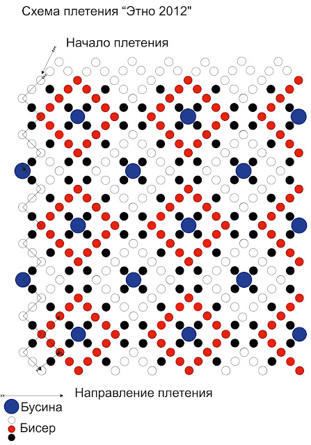Схема плетения основного элемента браслета, Снизки нанизываются в произвольном порядке, учитывая объём запястья и длину замка.