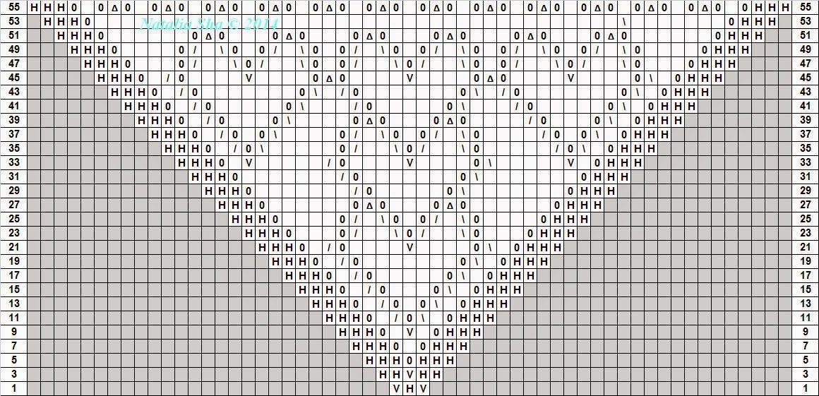 Размеры моей шали: 110 см по верхнему краю, 55 см - высота по центру.