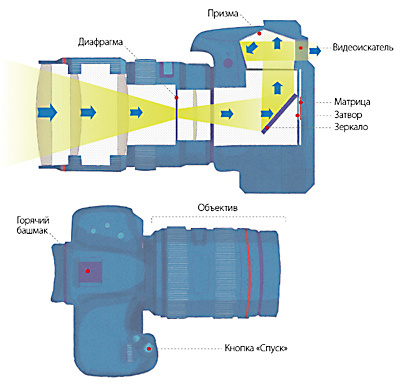 Количество света надо как-то регулировать, поэтому на пути света от объектива к матрице есть два устройства, контролирующих поток света: это диафрагма и затвор. Но о них мы поговорим чуть позже, когда будем разбираться с тем, как сделать фотографии светлее или темнее.