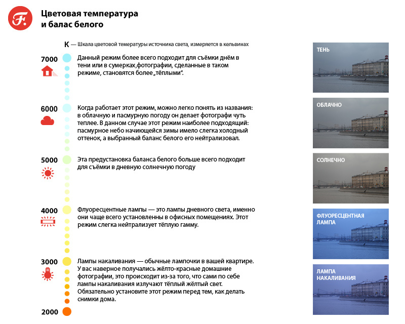 Для каждого источника света в цифровом фотоаппарате есть специальная настройка, которая позволяет правильно передавать цвета при любом освещении. Зрительно это можно контролировать по белому цвету в кадре. Он должен оставаться белым, не приобретая оттенков. Поэтому и настройка называется балансом белого.