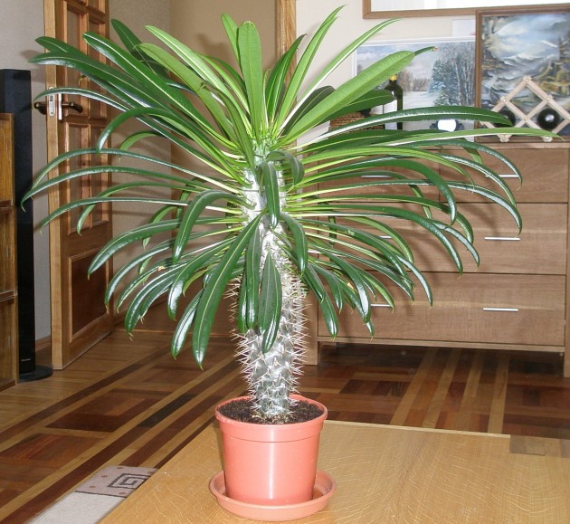 Эта причудливая экзотика давно завоевала любовь многих цветоводов. Не имеющий на самом деле никакого отношения к пальмам, пахиподиум выглядит очень представительно в домашнем интерьере.