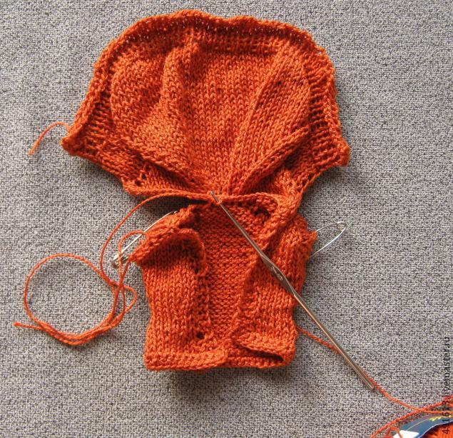 41 р: на спицах осталось 26 петель - закрываем и оставляем нить длиной 1 м, нить отрезаем, закрепляем - в дальнейшем этой нитью пришиваем воротник.