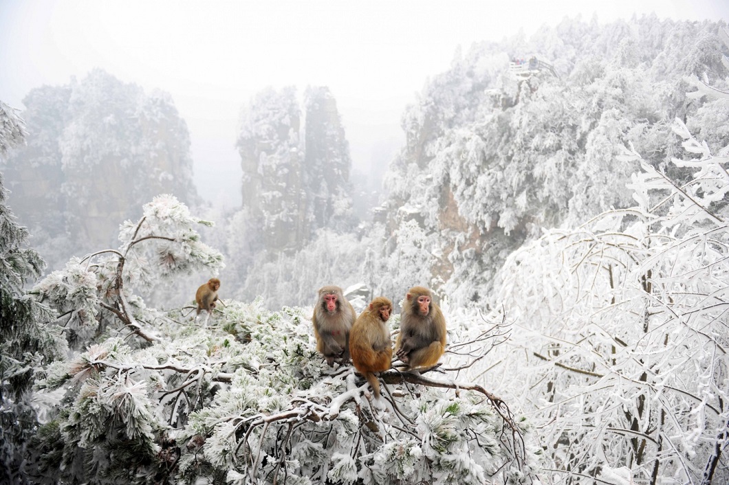 1. Макаки на заснеженных ветках деревьев в Национальном парке Чжанцзяцзе, на юго-востоке Китая, в провинции Хунань. (© Corbis)