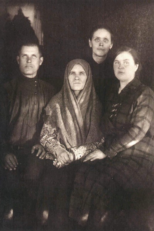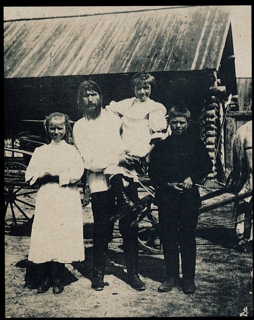 Семья Распутиных. В центре вдова Григория Распутина Параскева Феодоровна, слева — сын Дмитрий, справа — его жена Феоктиста Ивановна. На заднем плане — Екатерина Ивановна Печеркина (работница в доме).
