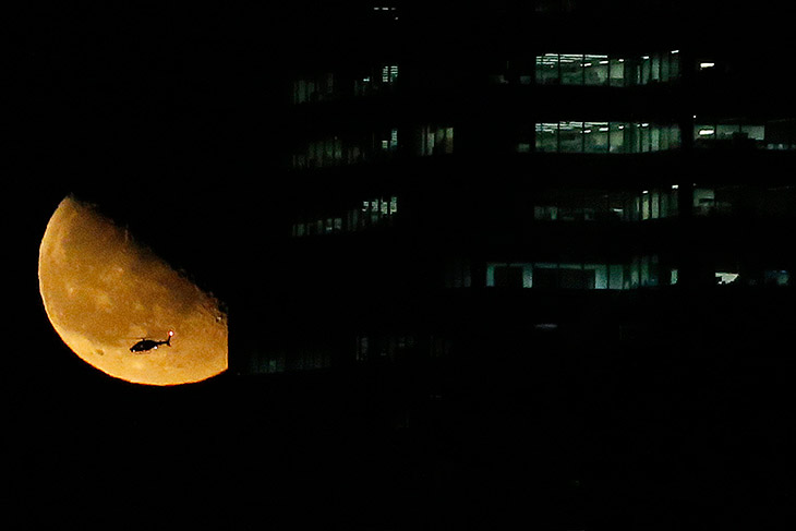 1. Вертолет над Нью-Йорком и Луна,13 марта 2015. (Фото Julio Cortez):