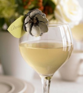 С помощью еловой шишки, плоскогубцев, акриловой краски и клея можно изготовить оригинальные карточки, подсказывающие гостям, кто где сидит. В средней части шишки с помощью плоскогубцев вырезаются небольшие колечки, которые затем окрашиваются и к ним приклеивается бумажка с именем гостя. Вся эта красота эффектно вешается на бокал.