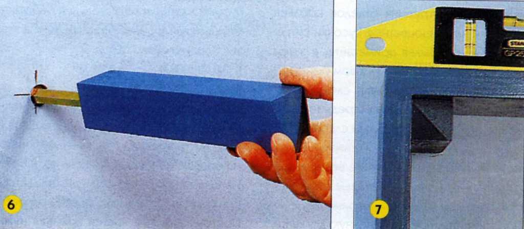 7. Вбив один кронштейн в стену, обоприте на брусок нужную ступеньку и проверьте, идет ли она строго горизонтально. Если да, можете отмечать на стене точку для второго отверстия.