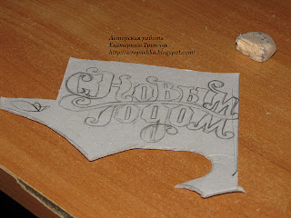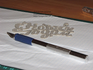 Вырезание-самый трудный этап,так что новичкам я бы посоветовала не брать надпись с завитушками.Сделайте для начала что-то попроще.Заметьте,все буквы у меня так или иначе соединены друг с другом.После вырезки получается единое целое.Ценный совет-сначала вырежьте все внутренние отверстия в буквах,а затем уже по внешней линии.Сразу скажу вырезать тяжело,но это возможно,показываю на собственном примере.Эту надпись я вырезала за вечер.Если вы решите взять картон потоньше,то примите во внимание то,что его может повести при проклеивании.