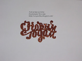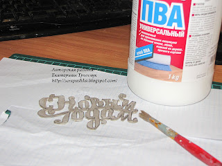 В связи с тем ,что толстый картон имеет свойство отслаиваться,особенно на узеньких участках и завитушках,мы должны нашу надпись проклеить.Поэтому аккуратно промазываем боковинки нашей надписи и прижимаем чем-нибудь.Следующий этап-это нанесение клея под глиттер