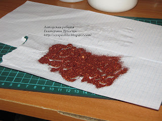 Наносим клей слоем погуще,но следим,чтобы в дырочках не образовалось сгустков.Насыпаем глиттер.